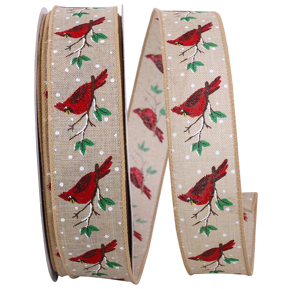 1 1/2" Cardinal Perched Natural Wired Edge Ribbon 50 Yards